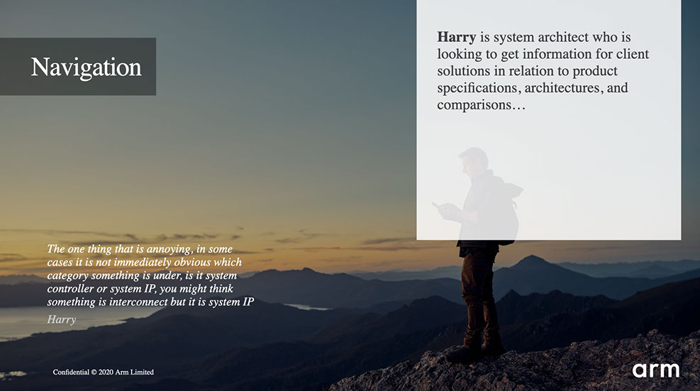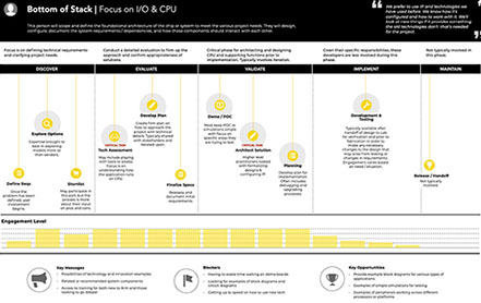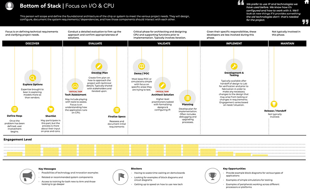 An outcome of the user research was a framework to simplify and segment the key personas that would be used in the new Arm Developer platform design. By viewing personas in different ways it became clear that using the lens of the technology stack, showed clear separation in user needs, behaviours, and ways of working, such that subsequent designs, content, and features could be compared with to assess the viability of the design, content, feature for that persona type.