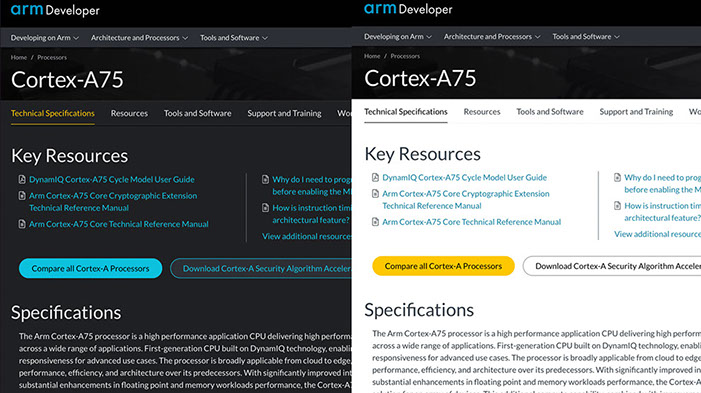 In parallel design documentation including and style guide were created to support the engineering team agile development process. The scale and scope of the project helped the design team advance and expand the Arm Design System ADS with new design elements, patterns, components, and visuals (eg. dark mode) using Adobe XD sticker sheet and ADS portal code snippets. This helped to speed up the design process, maintain consistency between designers, and enable developers to use validated code.