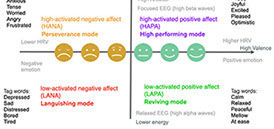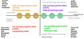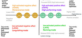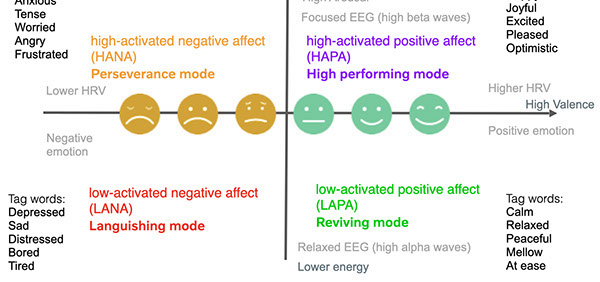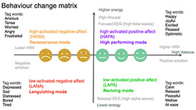 In recent years I have expanded the model in exploring different relationships and applying it to a continuous monitoring of a users state of mental well-being by understanding the physiological patterns related to negative and positive emotions in relation to measures of arousal and valance. With this I created a model encompassing The Circumplex Model of Affect and emotion tag word triggers for well-being, where biometric data and the arousal / valance relationships could be related to states of high-activated positive affect (HAPA) High Performing mode, high-activated negative affect (HANA) perseverance mode, low-activated positive affect (LAPA) reviving mode, and low-activated negative affect (LANA) Languishing mode. This can be applied to understanding behaviour change and the degree to which the product design action elicits the high performing mode HAPA, indicating a high probability of behaviour change, or the perseverance mode HANA where a low probability of behaviour change is exhibited, and to also identify when user exhibits reviving mode LAPA indicating a desire but the design is lacking enough optimism or excitement, and if users show signs of languishing mode LANA indicating they may have deep routed beliefs against the action that would require a different approach, and could be considered as not the target audience for the designed action.
