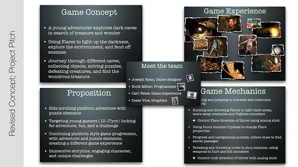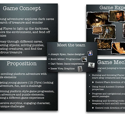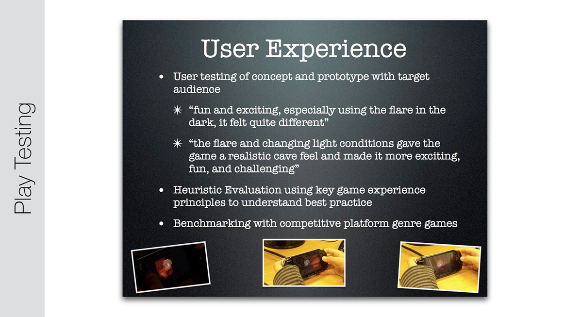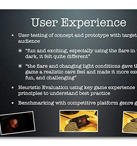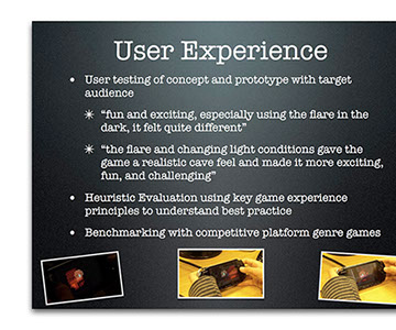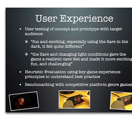Sony Playstation First is a student award programme in which University teams compete to be one of five winning PSP minis titles which Sony will support (with QA help and marketing) to get the games published on the Playstation network and available to millions of users. The game concept was based on earlier research into the PSP games market as part of the Games Design Module (MA User Experience Design) and the idea of ‘Marama and the Golden Egg’ for a side scrolling puzzle adventure type game. As we explored the concept with early prototypes it became clear that using a Flare in a dark cave was central to the game experience, and the name for the game was born. During development I conducted heuristic testing of the game mechanics and controls, benchmarking the concept against current PSP mini titles from the same genre, and usability testing. Our submission was selected by Sony from many entries received from several Universities across Europe, as one of five that would get their support to be published on the Playstation Network Store.