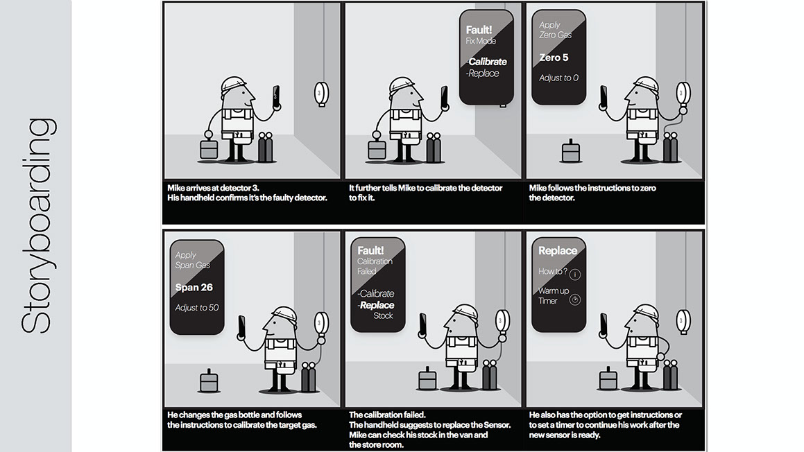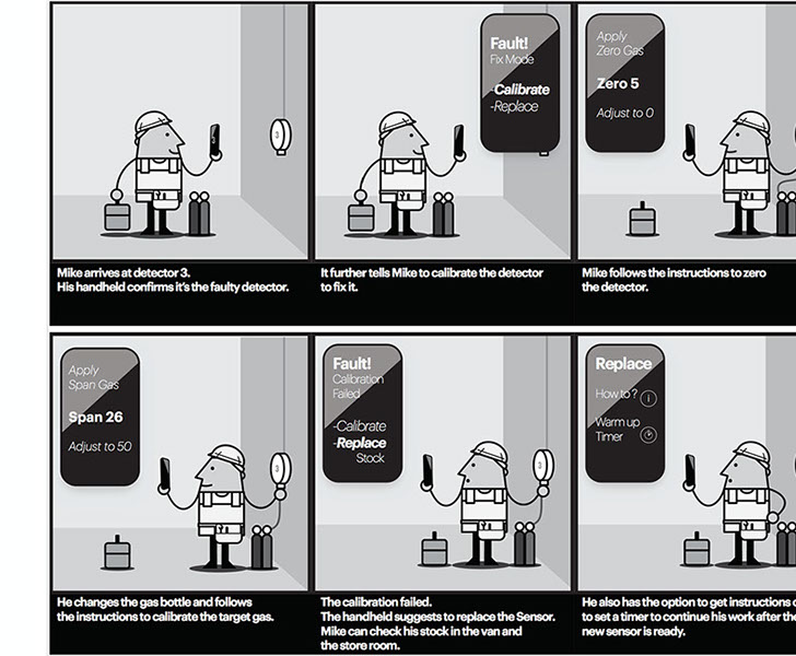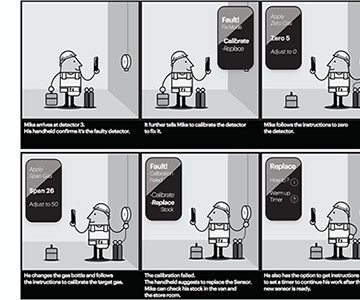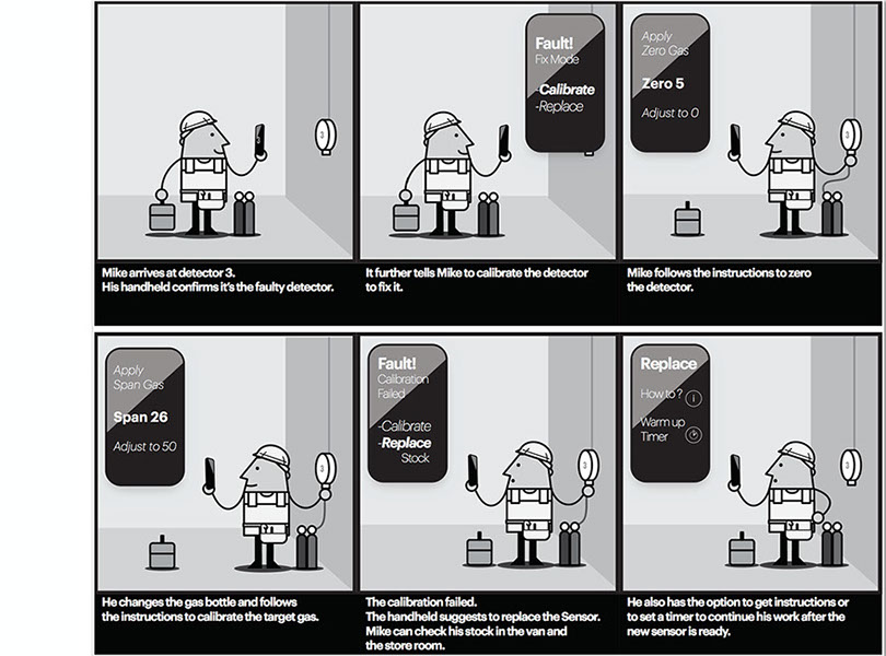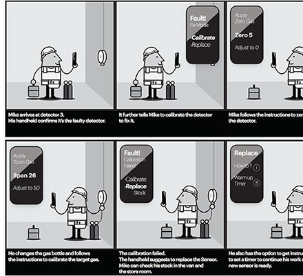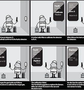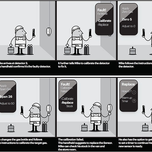 Gas detection is key to the safe operation of industrial gas plants. Keeping the gas sensors maintained and calibrated was an area in need of efficiency improvement. Understanding all aspects of the problem started with ethnographic and observational research with industry professionals both on-site and in workshops. The data helped inform storyboards showing potential scenarios where IoT technology would allow 1 worker to perform the tasks more efficiently of what currently requires 2 workers. Further deliverables included user journeys and task flows.