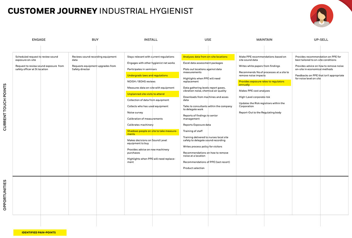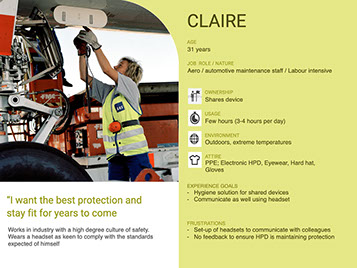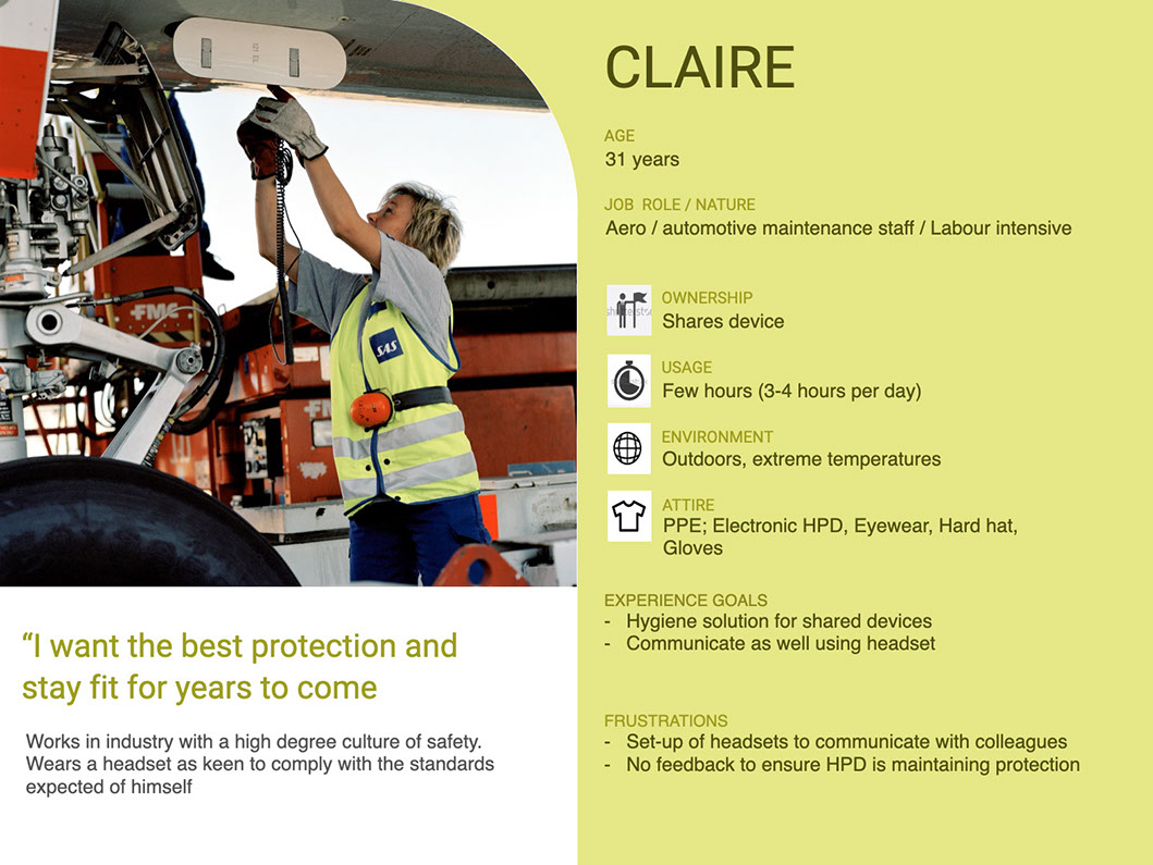 This helped to validate assumptions and needs with the industrial design requirements, and also gauge the acceptance and potential barriers of introducing personal noise monitoring, and how organizations currently approach noise exposure issues in the different industries. It also provided qualitative data to build a set of 5 user personas that could be used for the project.