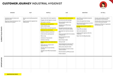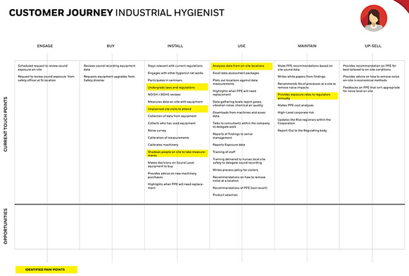 In addition we identified the key industrial and worker stakeholders and segments that would be most influential in the reduction and/or impacted by noise exposure, and the team conducted a wide range of interviews both in the US and UK with people working in each of the sectors to capture the observational voice of the customer (OVOC) qualitative data around current policies on noise safety, selection criteria used for hearing protection & communication, value of personal noise monitoring, response to the storyboard scenarios.