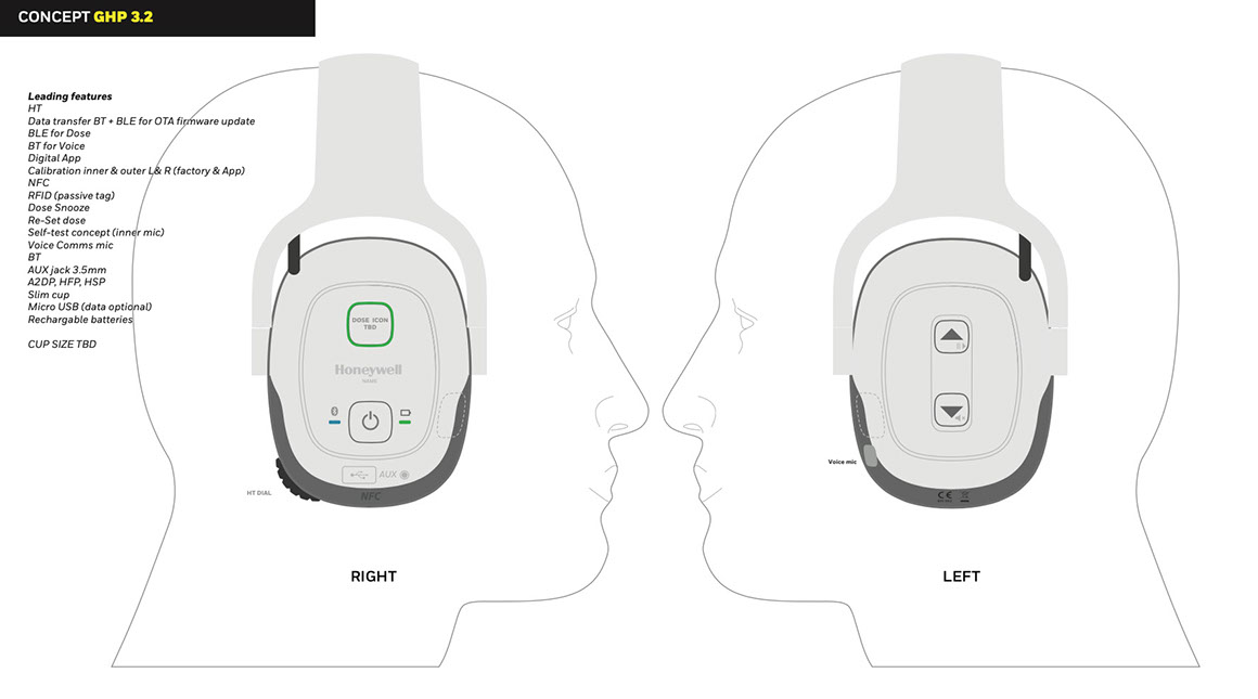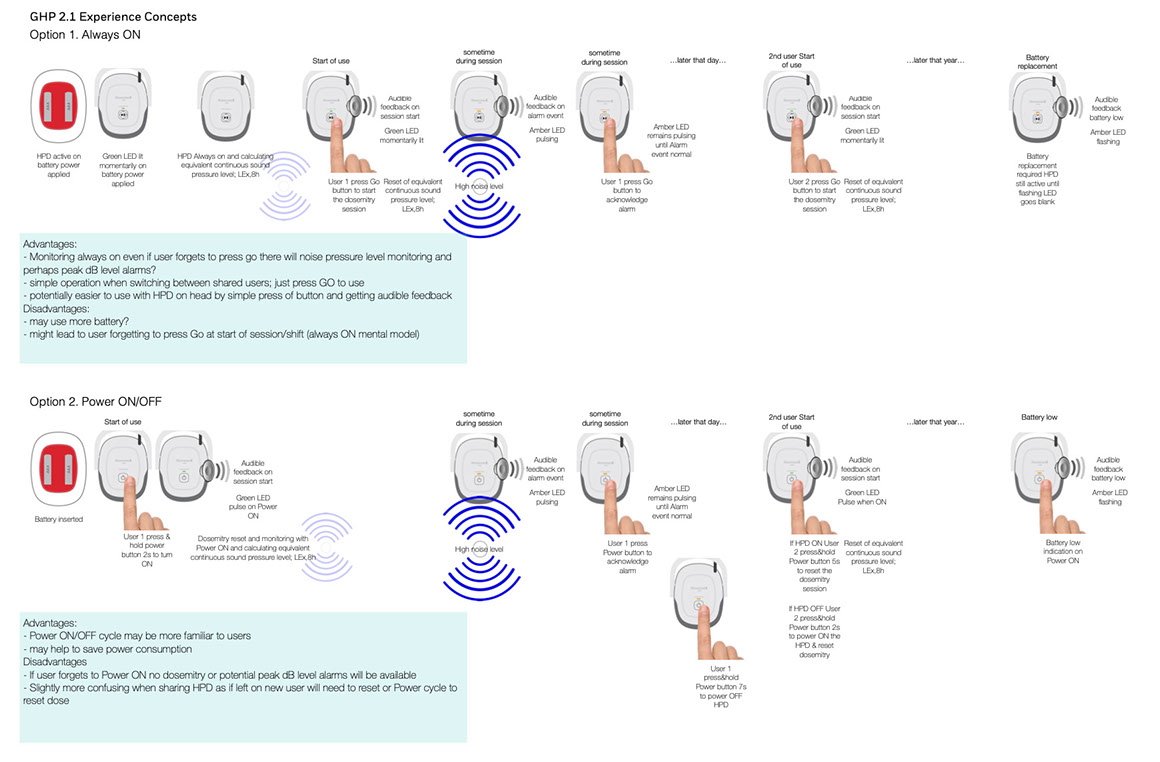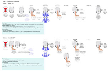 With a product vision, validated assumptions, OVOC user research, personas, and customer journeys we could move forward both with the hardware design to accommodate additional components and electronics to measure and transmit via bluetooth the noise level entering the ear, and an easy visual cue on the headset to show level of exposure above normal threshold levels, using the design system LED visual style from the approach taken in the gas detection products.