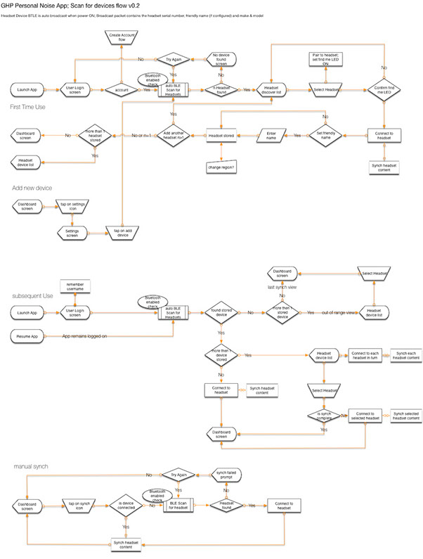 In addition user flows for key tasks such as setup (adding a device) connecting and reviewing noise data were created along with simple wireframe designs for a companion mobile app to capture and record the noise data, present this back to the user, and track accumulated levels, along with suggested quiet periods to reduce the cumulative impact.