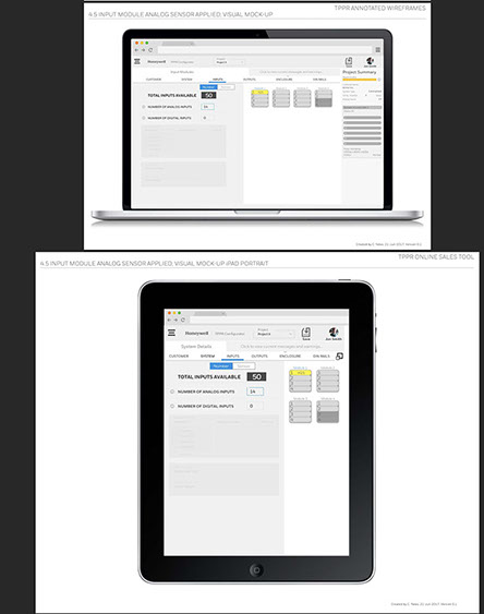The prototype was very well received by the sales team and customers loved the idea of being able to explore configuration by themselves, saying this was something our competitors did not offer. The annotated and responsive (web and tablet) designs and prototype allowed the the development team to quickly assess feasibility of the cloud based approach and to come up with the technical requirements around security (separate area for customers and sales, and sandbox solutions for each customer), user profile management, authentication, and integration to system engineering tools to speed up the end-to-end delivery process. These were then added into the design flow, screens, and documents resulting in a new browser based and platform agnostic, responsive (desktop and tablet computer) sales configuration tool that would integrate seamlessly to the system engineering build tool, allow customers exploration, and sales team to share and re-use existing customer configurations, resulting in a major uplift in product sales, and re-establishing Honeywell as thought leader in this market segment.