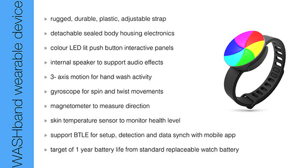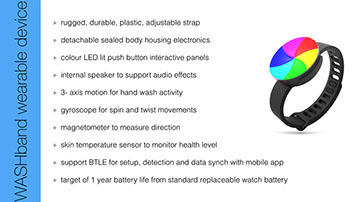 A wrist worn device to encourage regular hand-washing and transfer of good hygiene practice. Use of gameification techniques to affect behavior change