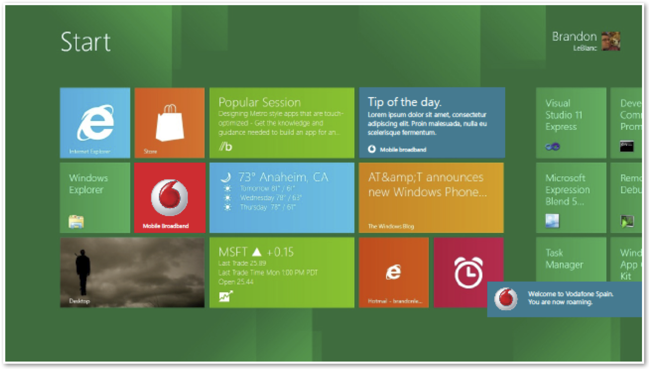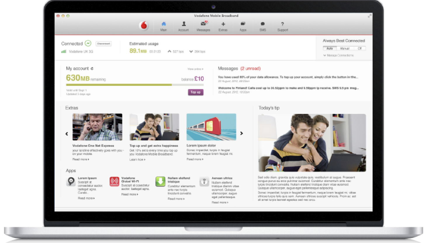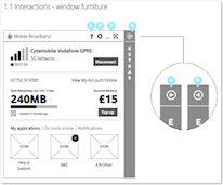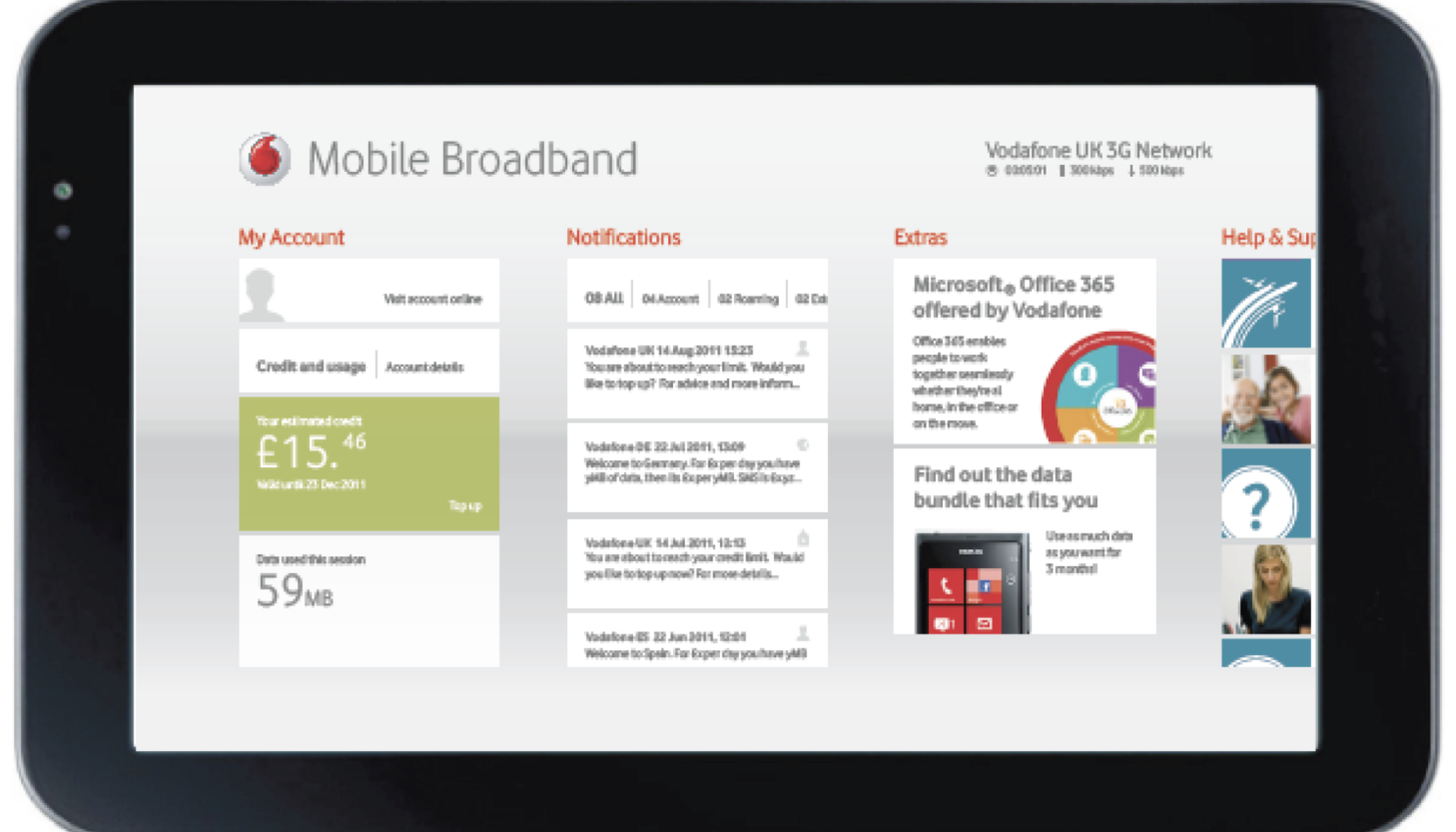 With the introduction of Windows 8 by Microsoft Vodafone was uniquely positioned as a strategic partner to develop a Modern UI Application to coincide with the launch. This required a re-imagine of the Mobile Broadband function and re-design from the ground up, looking at the business and user requirements, OS & API capabilities, and the new Modern UI design approach, style, and interactions based on a full screen (no chrome) touch first interface. This required creating a new set of user scenarios, storyboards, and use cases to describe the business requirements around the key areas of account management, notifications, extras, and help & support. A new interaction style was designed to present the information in accordance with the evolving Modern UI style guide.