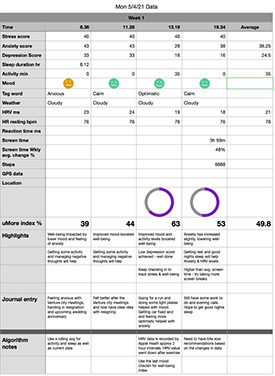 To help with this I used an Apple smartwatch for steps, exercise, heart rate (HR), heart rate variability (HRV), and activity data, a Fitbit Sense smartwatch for comparative step count, sleep, and its capability to measure stress using an EDA sensor, an Oura ring for body temperature and sleep tracking. In addition the iPhone provided location data, local weather, and screen time, plus I later added a blood pressure tracker and a Muse headset to capture EEG brain activity in relation to active, neutral, and calm modes. Apple Health was used as the main mobile app to collect data, along with the Fitbit app which was able to provide sleep duration, sleep quality, and a derived Stress management score. The Oura mobile app provided a detail breakdown of sleep in relation to light, REM, deep, and awake, along with a readiness score related to activity, recovery, and sleep levels. I entered all the app data into a spreadsheet along with daily mood checkins, emotion journalling, and level of stress, anxiety, depression from self-reported surveys, and I derived an initial well-being algorithm score based on a combination of mood level, emotion word sentiment, and the % variation from daily normal levels of stress, anxiety, depression, sleep, and activity. In addition other data points were collected on an ad-hoc basis such as glucose level, sweat and hydration level, facial EMG emotion detection using the phones front facing camera, and reaction times calculated using a mobile app.